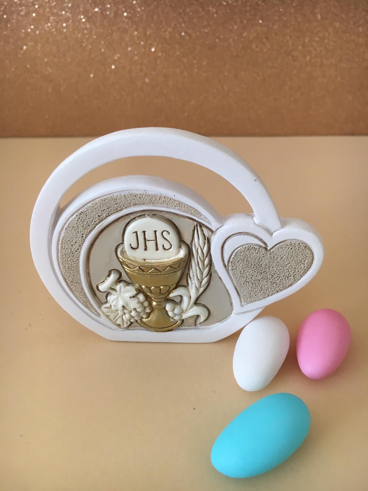 Kommunion Aufsteller Herz IHS in Geschenkkarton, gefüllt mit 5 Confettis blau, rosa oder weiss, Mandeln oder Schoggi.